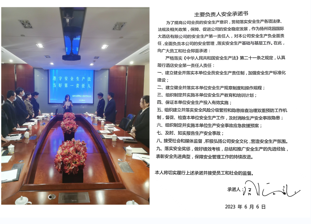 党支部书记、总经理舒向锋签署、宣读《企业主要负责人安全承诺书》,并作出庄严宣誓,承诺九项关于履行安全生产第一责任人法定职责的义务。舒向锋强调,各部门要按照序时进度要求,认真组织完成“安全月活动计划和隐患专项排查整治行动工作清单”的各项工作任务,安全工作重在落实,要加强安全隐患排查整改,加强安全培训和应急演练,提高全员安全意识和安全技能,营造良好的安全工作氛围。(花园国际 贾军)